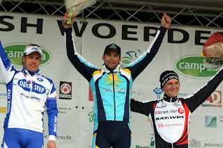 Und dahinter kommt es noch mal zum Sprint des Feldes, es sind ja viele starke Sprinter hier am Start! Der Topsport Vlaanderen-Zug deklassiert hier gerade alle anderen, der ist ja auch wahnsinnig gut besetzt, perfekte Zug-Leistung, leider reicht es für Graeme Brown aber nur zu Platz 10. Stuart O'Grady (FUJ) wird Elfter, gefolgt von Goddaert (ALM), der schon bei Nokere-Koerse einen überraschend starken Sprint zeigte. Die Top15 komplettieren dann Jimmy Casper (BMC), Hans Dekkers (RRC) und Tom Veelers (BBO).